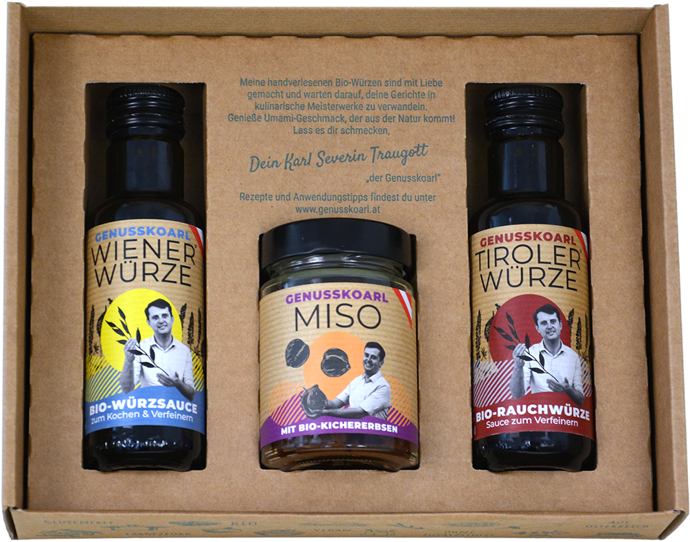Mit dieser Geschenkbox erhältst du den Ursprung von Genusskoarl: Unsere Klassiker, die den Beginn unserer Reise geprägt haben. Enthalten sind drei Produkte, die für ehrlichen Geschmack und traditionelle Fermentation stehen: