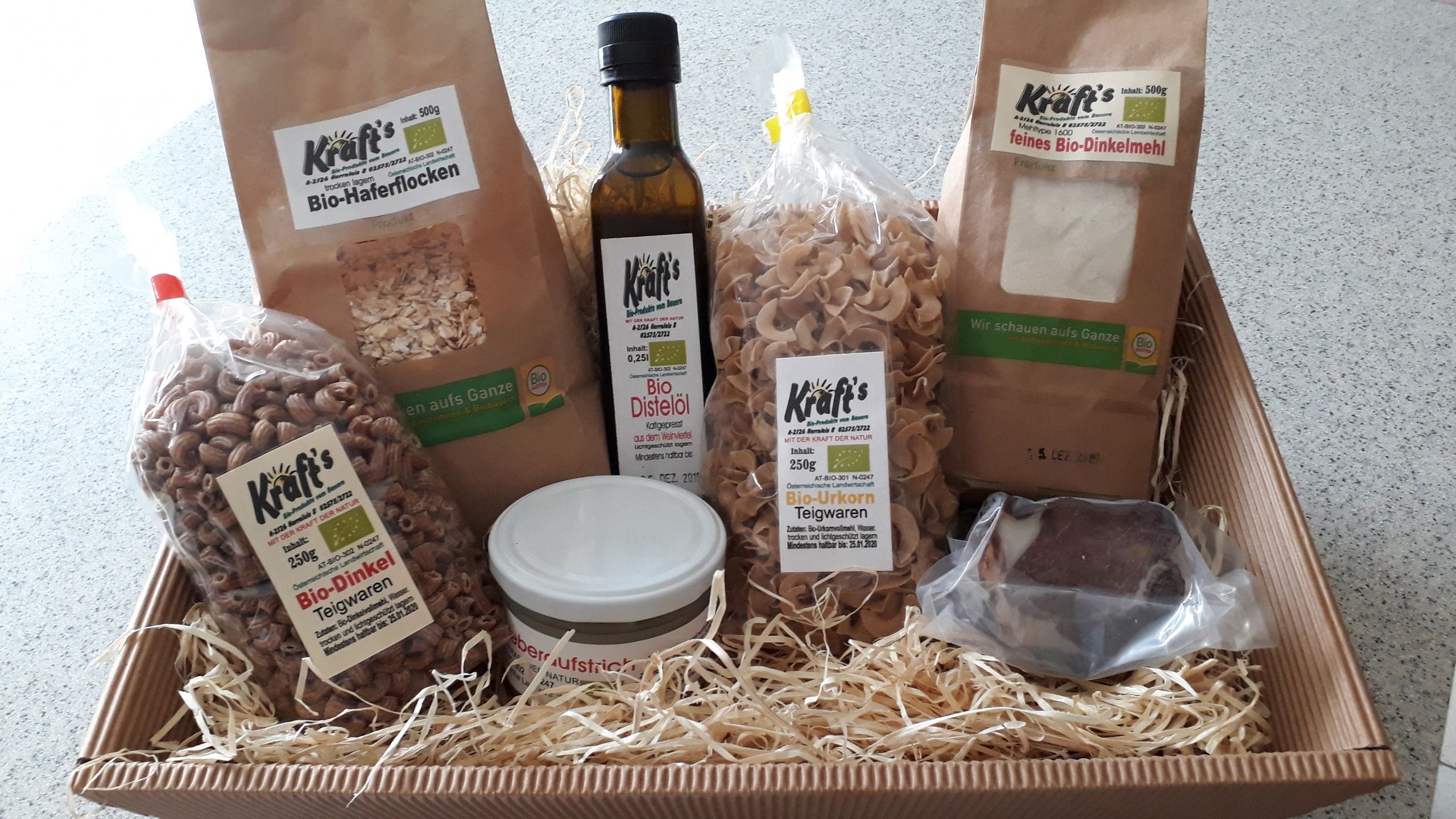 - Produkte: verschiedene Sorten Nudeln Weizen + Dinkel, Apfelsaft, Apfelsaft mit Wasser, Pfirsich – Fruchtaufstrich, Rote Ribisel Fruchtauftstrich, Apfelringe, Apfelmus, Eier