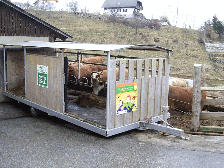 Aber der Anhänger hat noch weitere Funktionen: Er wird auch als Behandlungsstand für die Tiere genutzt. Zusätzlich können die Fressgitter auch abgesenkt werden. Das macht Josef Wiedenhofer im Winter. Dann kann der Anhänger als Futtertisch genutzt werden. Das Heu wird im Wagen (unter Dach) den Tieren vorgelegt. Die Tiere können von außen an das Futter gelangen.