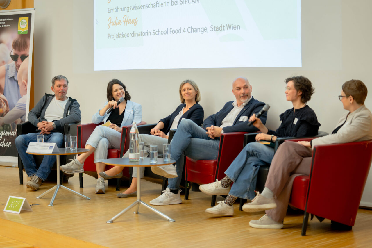 Anna Strobach, Obfrau von ZUKUNFT ESSEN, ging mit ihrem Vortrag auf die Bedeutung von schmackhaftem und gesundem Schulessen für die Gesundheit der Gesellschaft aber auch des Planeten ein. In einer spannenden Podiumsrunde unter der Leitung von Johanna Auzinger von BIO AUSTRIA wurden wichtige Aspekte wie die Rolle von Bio-Lebensmitteln und die gesellschaftliche Relevanz von Schul- und Kindergartenessen mit Expert:innen aus der Branche diskutiert. Die Podiumsgäste gaben zudem spannende Einblicke in Ihren Alltag als Landwirt, Beraterin, Küchenleiter und Ernährungswissenschafterin.