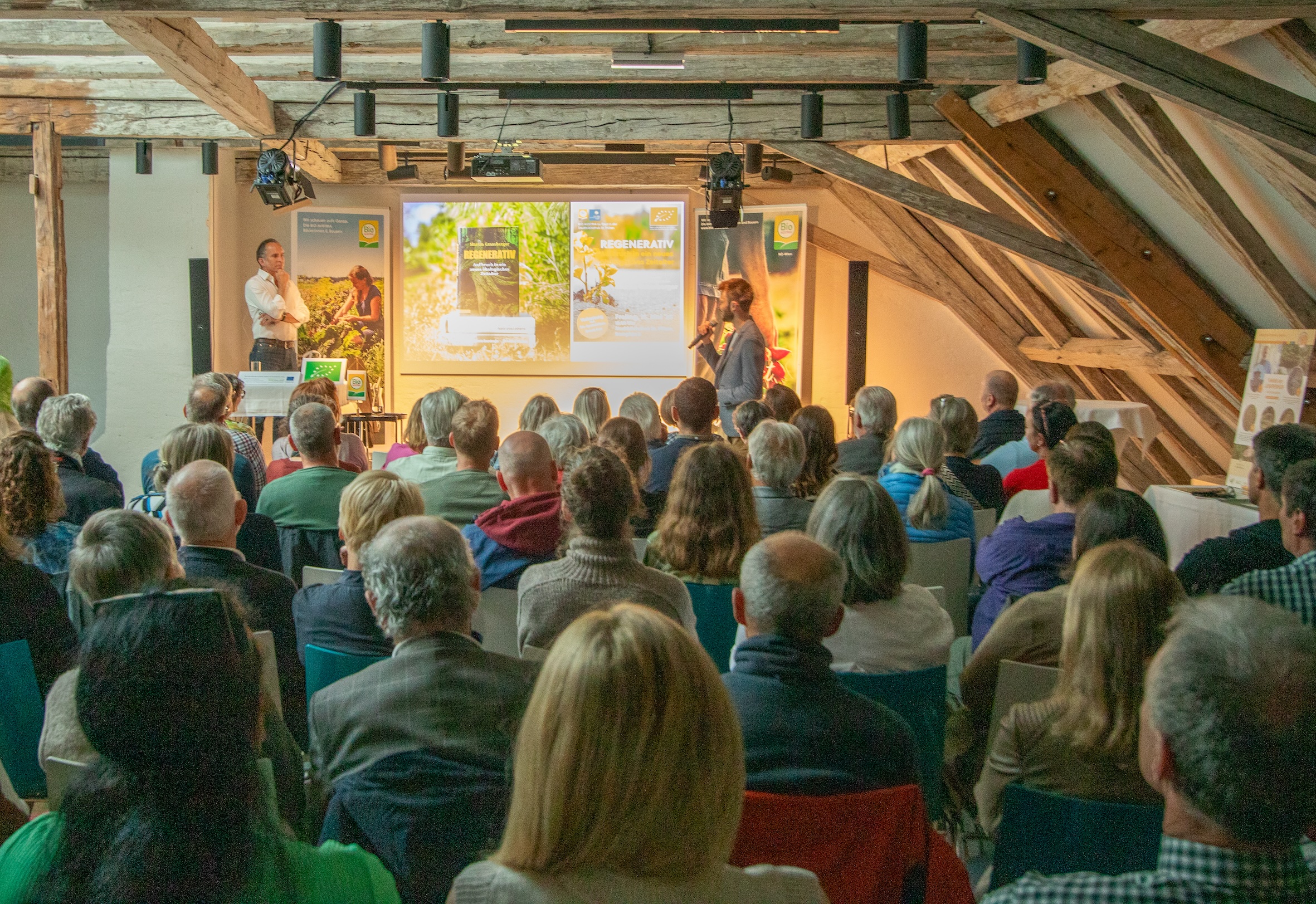 Beim gemütlichen Ausklang konnten die Zuhörer:innen mit den Bio-Bäuerinnen und Bauern sowie mit Vertreter:innen von BIO AUSTRIA ins Gespräch kommen und sich über die Qualität hochwertiger Bio-Lebensmittel und die Bio-Landwirtschaft informieren. Ein Info-Tisch mit vielfältigen Materialien lud zum Nachlesen ein.