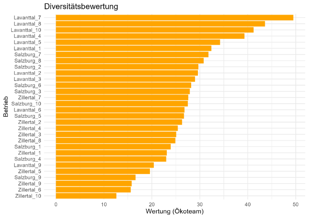 Abbildung 1: Vergleich der gesamtbetrieblichen Artenvielfalt der 30 untersuchten Bio-Betriebe.